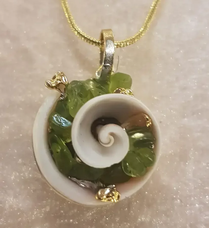 Dieser außergewöhnliche Anhänger mit Olivin (Peles Tränen) vereint Natur, Symbolik und künstlerisches Design in einem einzigartigen Schmuckstück. Eingearbeitet in eine Muschelform mit spiralförmiger Struktur, entsteht ein harmonisches Gesamtbild, das an die Schönheit des Ozeans und die Kraft der Erde erinnert.